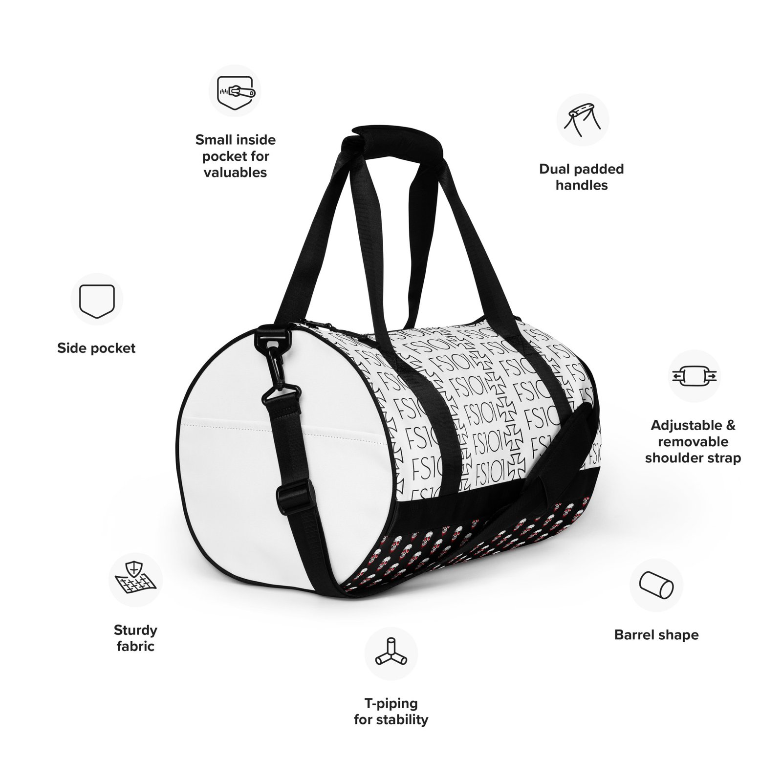 Ready to get your fitness on? Add some punch to pumping iron with this all-over print gym bag. Made from 100% polyester and sturdy, water-resistant fabric, this bag is fun meets function. And it’s got pockets!